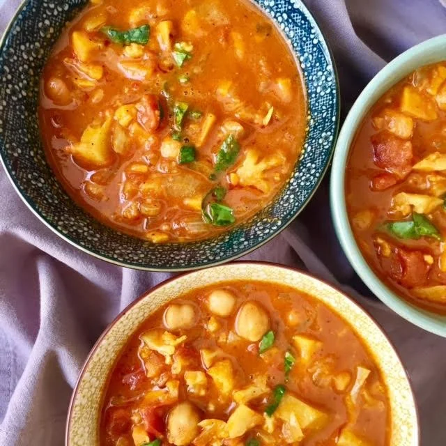 Stir in the rest of the spices until the onions are well covered, then add in the tomatoes and cook for 5 minutes. Add in the sweet potato, cook for 5 minutes and then tip in the chickpeas, coconut milk and cauliflower. Apply heat, stirring constantly, until the mixture starts to bubble, then turn down and simmer with a lid on for 20-30 minutes until the vegetables are cooked through. If it looks too thick, loosen with a little splash of water.